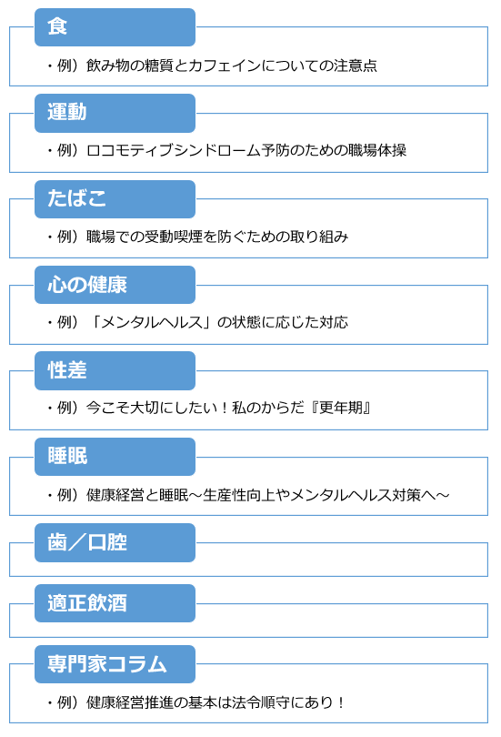 「健康企業宣言」にご参加いただくと、「健康企業宣言システム」上で取り組みに役立つコラムや動画(随時更新)を以下の分野に渡ってご覧いただけます。